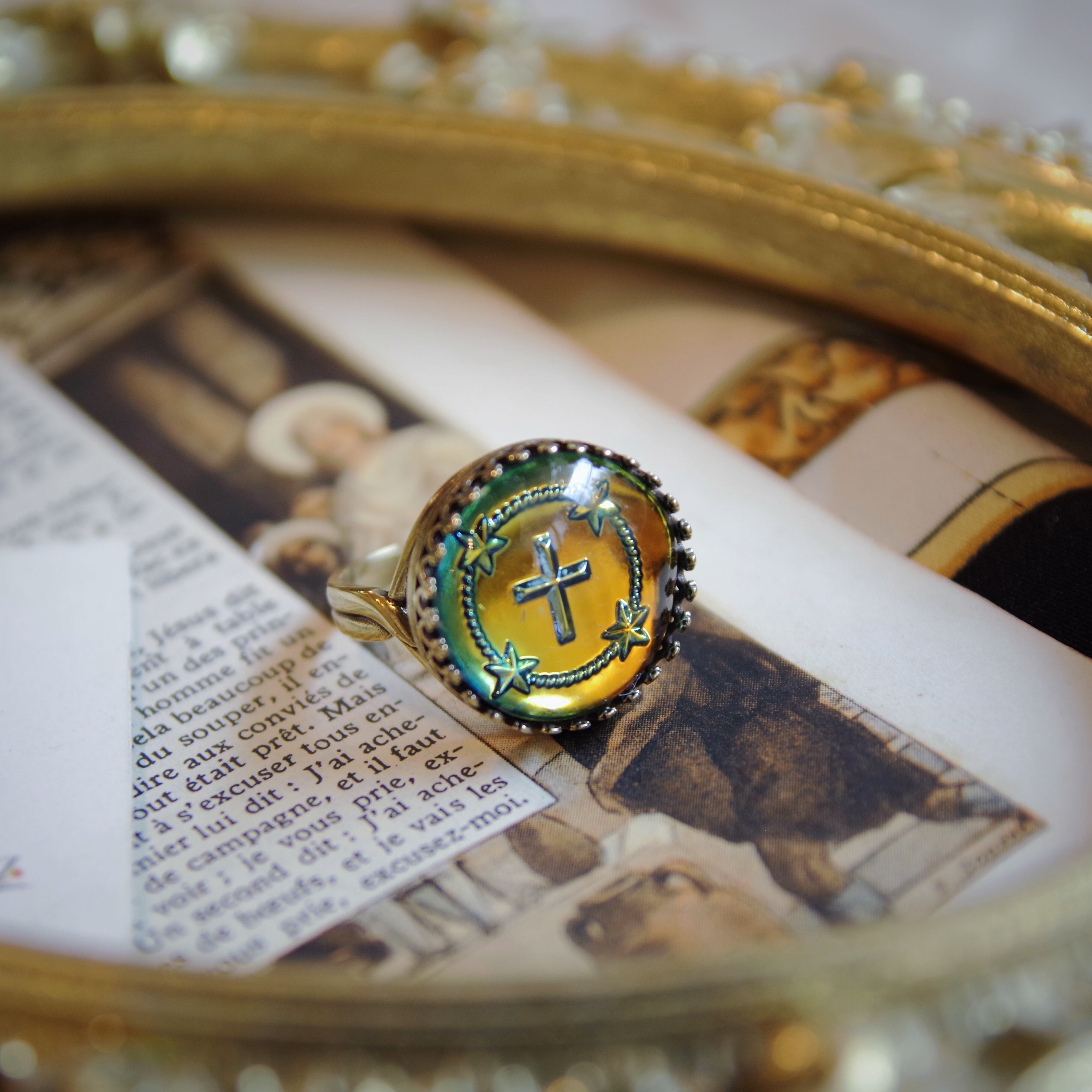 ドイツから仕入れた1970年製のヴィンテージガラスインタリオ。角度によってオレンジやイエロー、ブルーやグリーンに見える珍しいカラーで存在感あるリングに仕上げました。