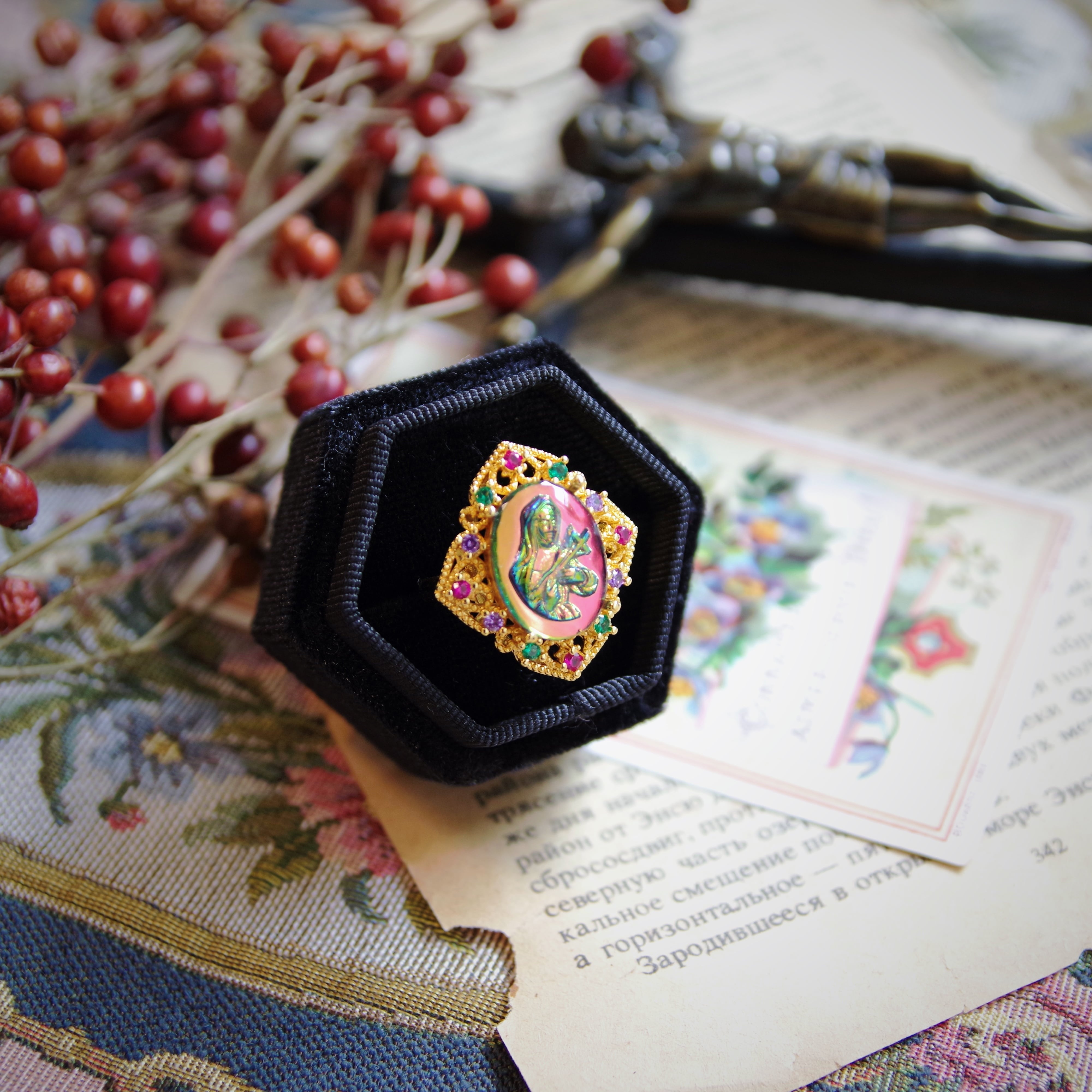 ドイツから仕入れた1970年製のヴィンテージガラスインタリオ。マザーテレサが彫られたインタリオで、ピンクや玉虫色に見える偏光カラーが美しく、リング台座のストーンもカラフルで個性的なリングに仕上げました。