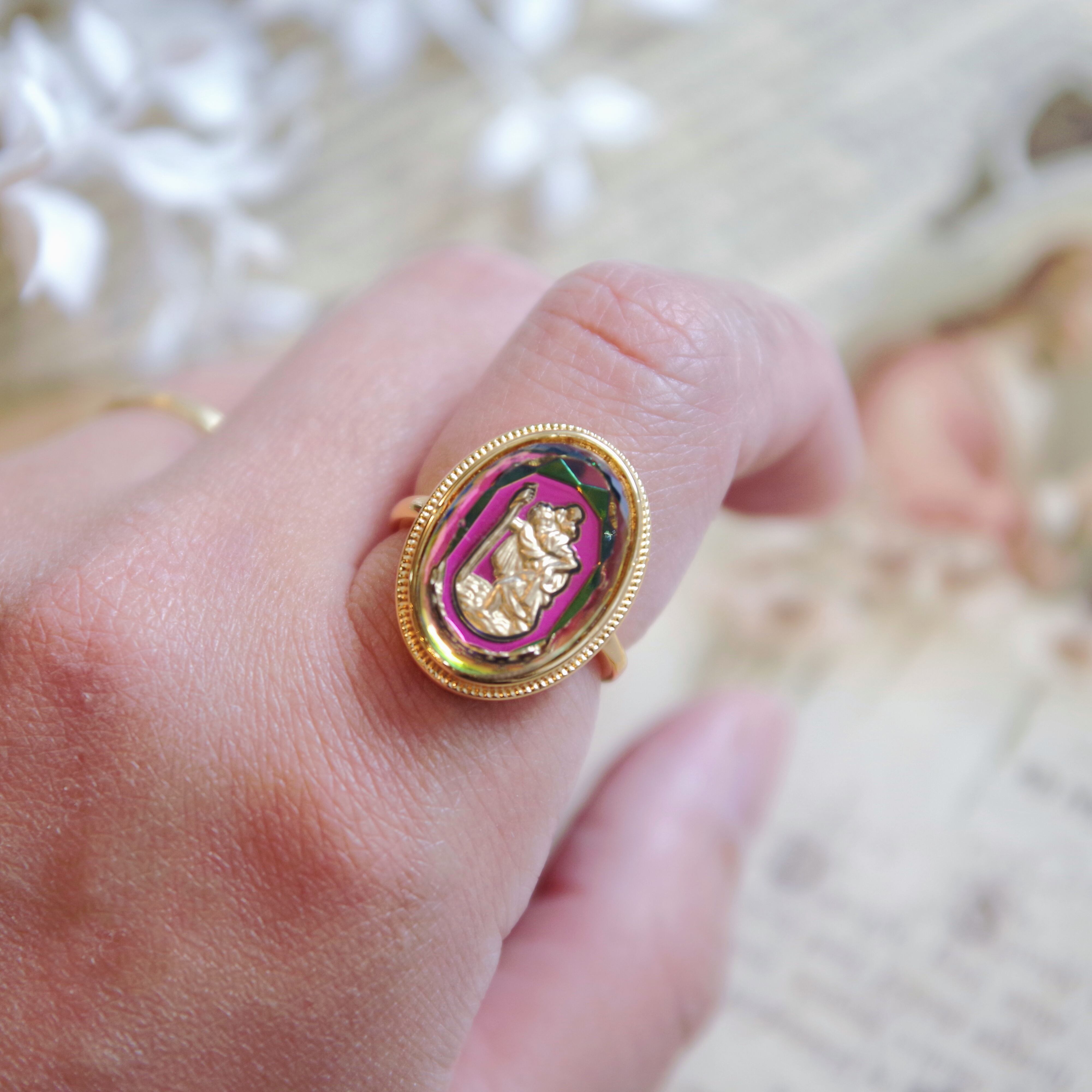 ドイツから仕入れた1970年製のヴィンテージガラスインタリオ。ゴールドでクリストフォラスが彫られたデザインで、玉虫色に見える偏光カラーと宝石のようなカッティングも美しいガラスです。