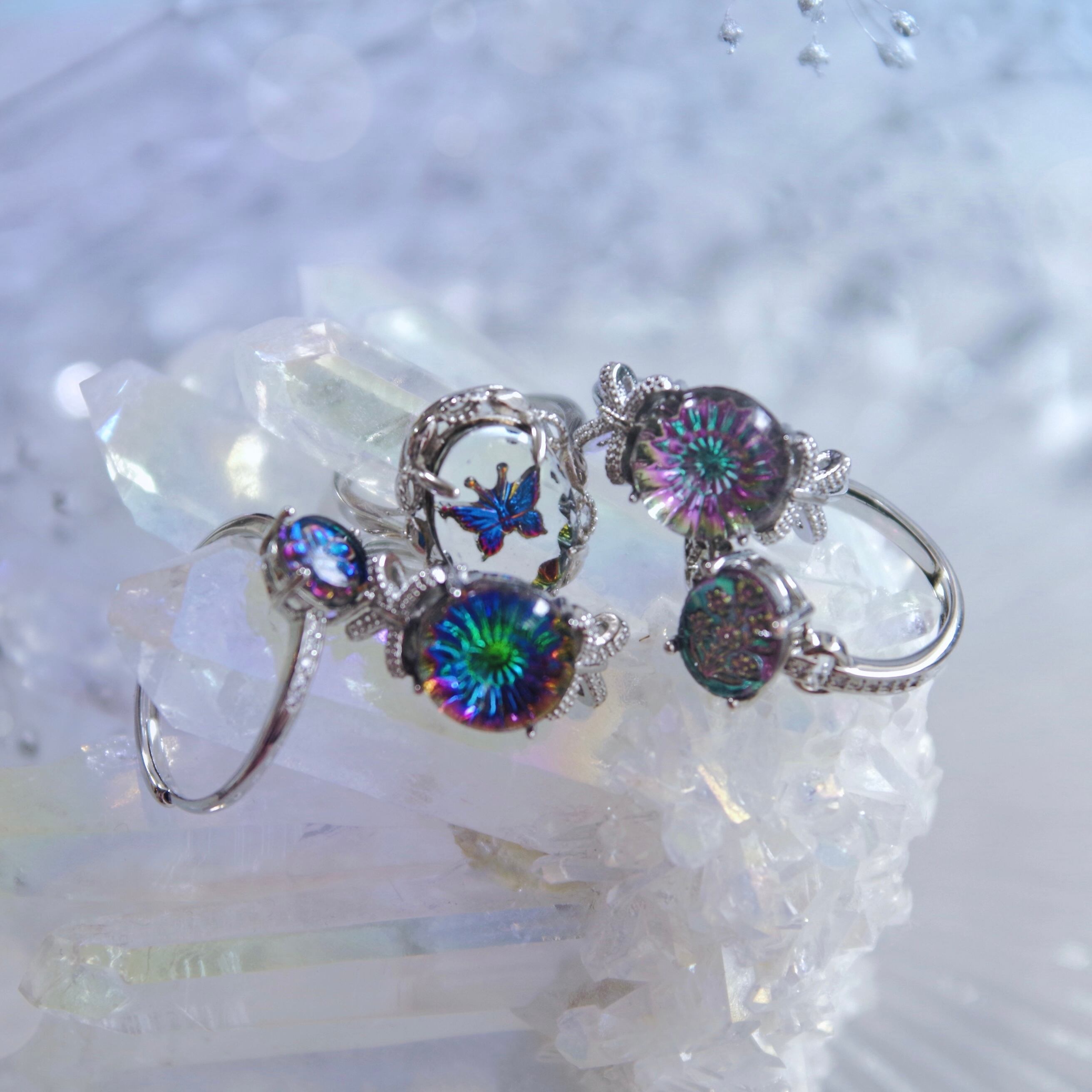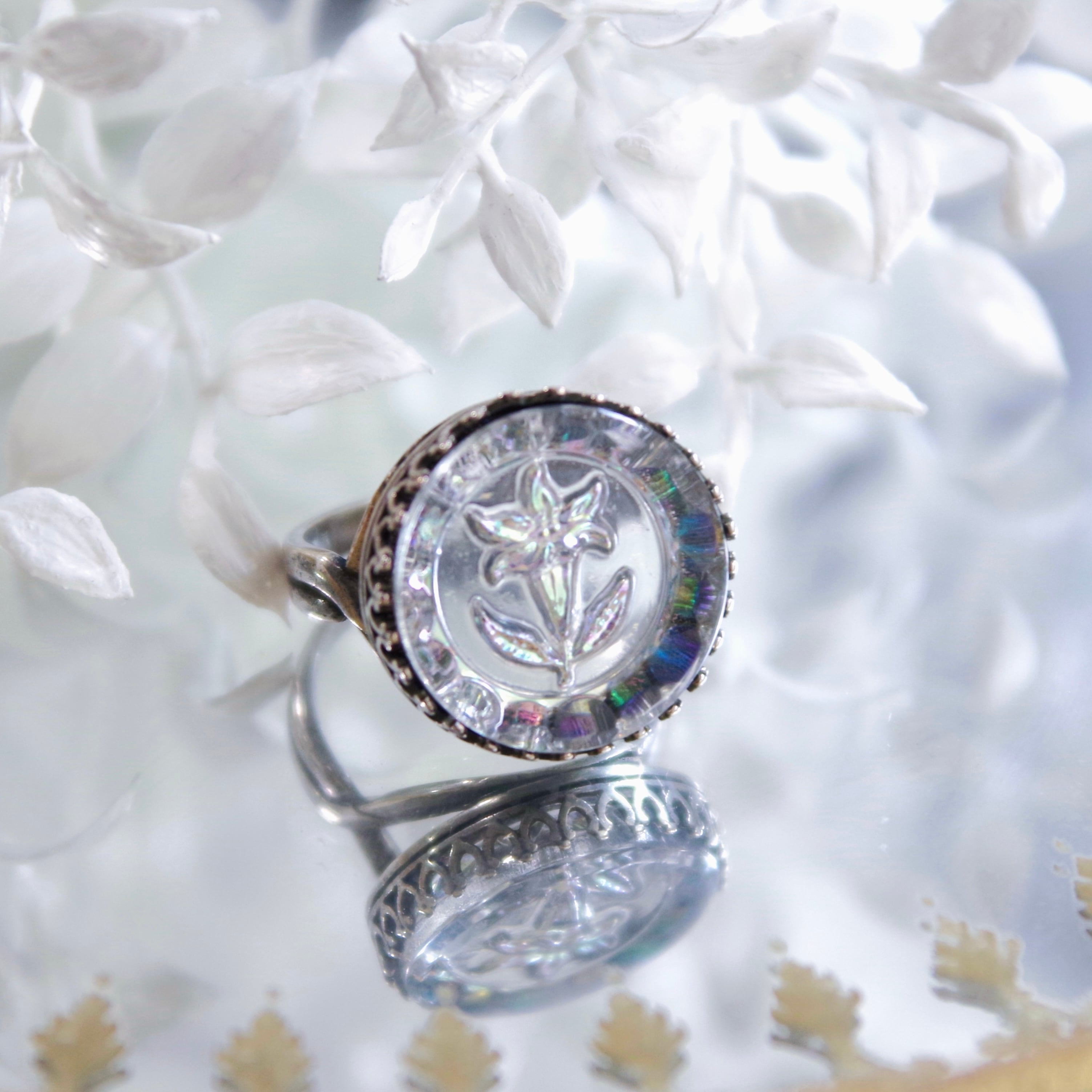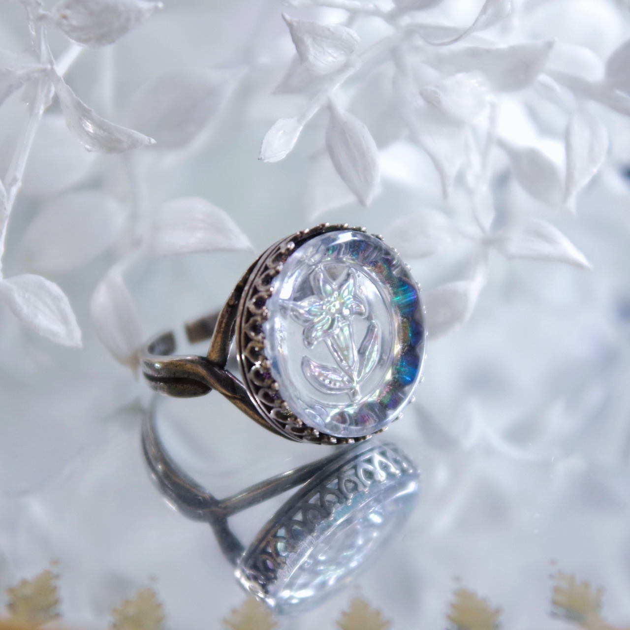 リング台座は裏彫りの技術と透け感を楽しんで頂きたいので、裏が見えるものを選びました。