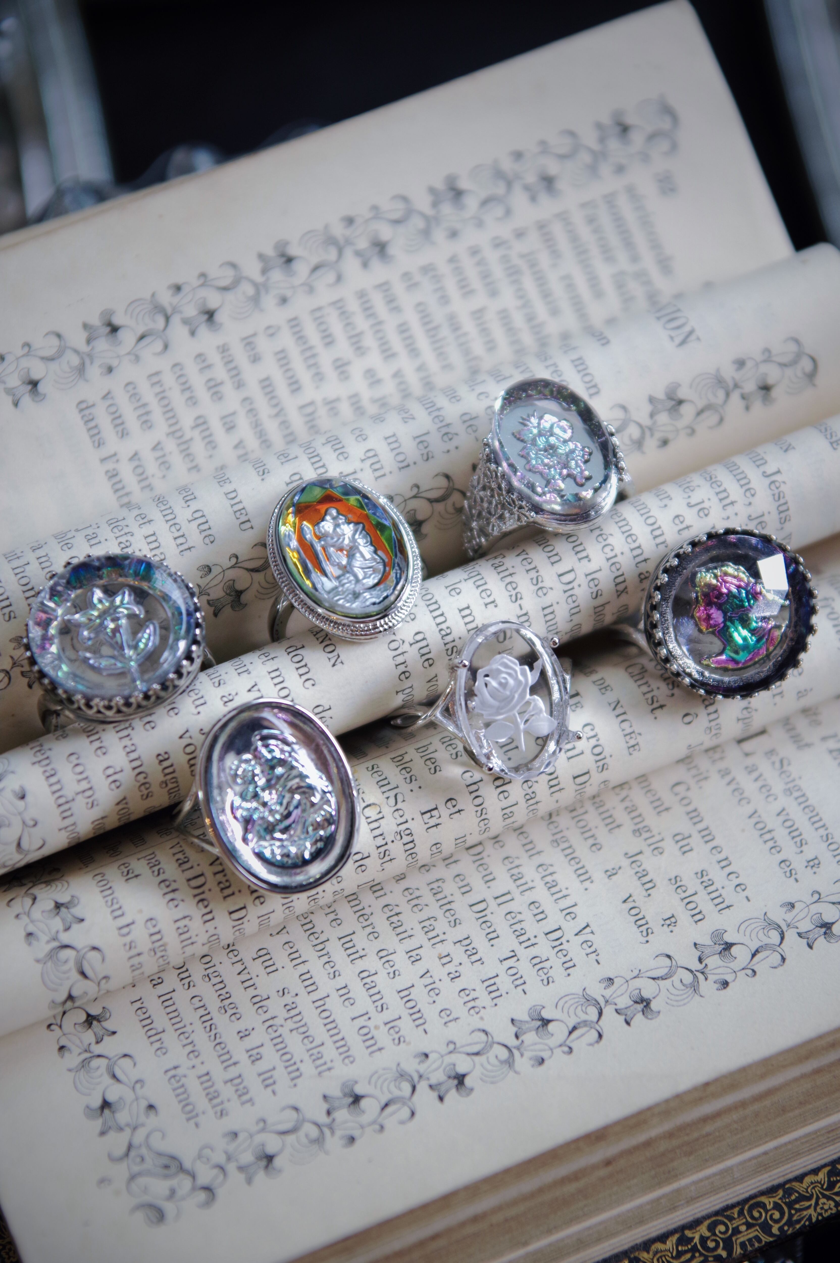ドイツから仕入れた1970年製のヴィンテージガラスインタリオ。シルバーでクリストフォラスが彫られたデザインで、玉虫色に見える偏光カラーと宝石のようなカッティングも美しいガラスです。