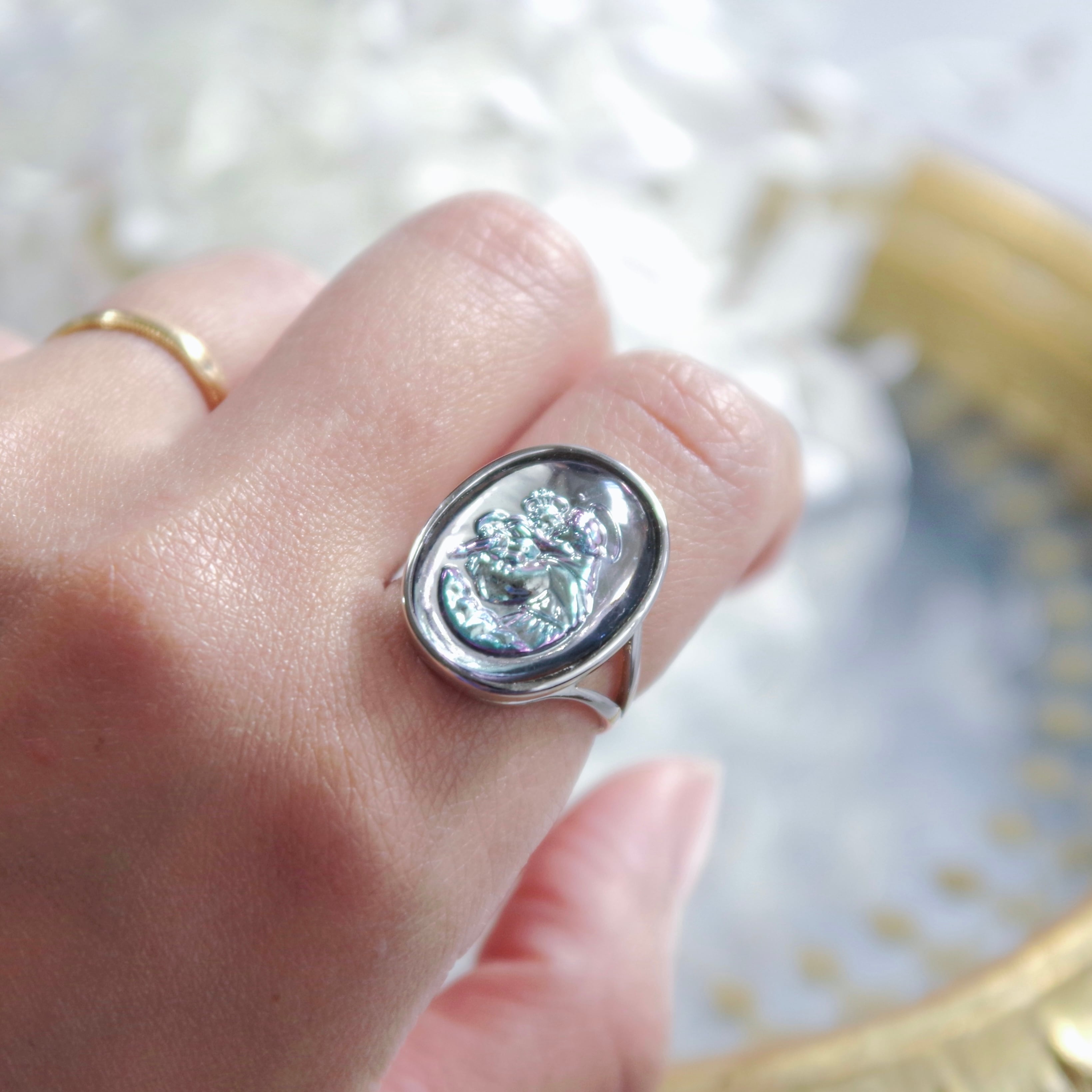 リング台座はインタリオが映えるようにシンプルなものを選びました。