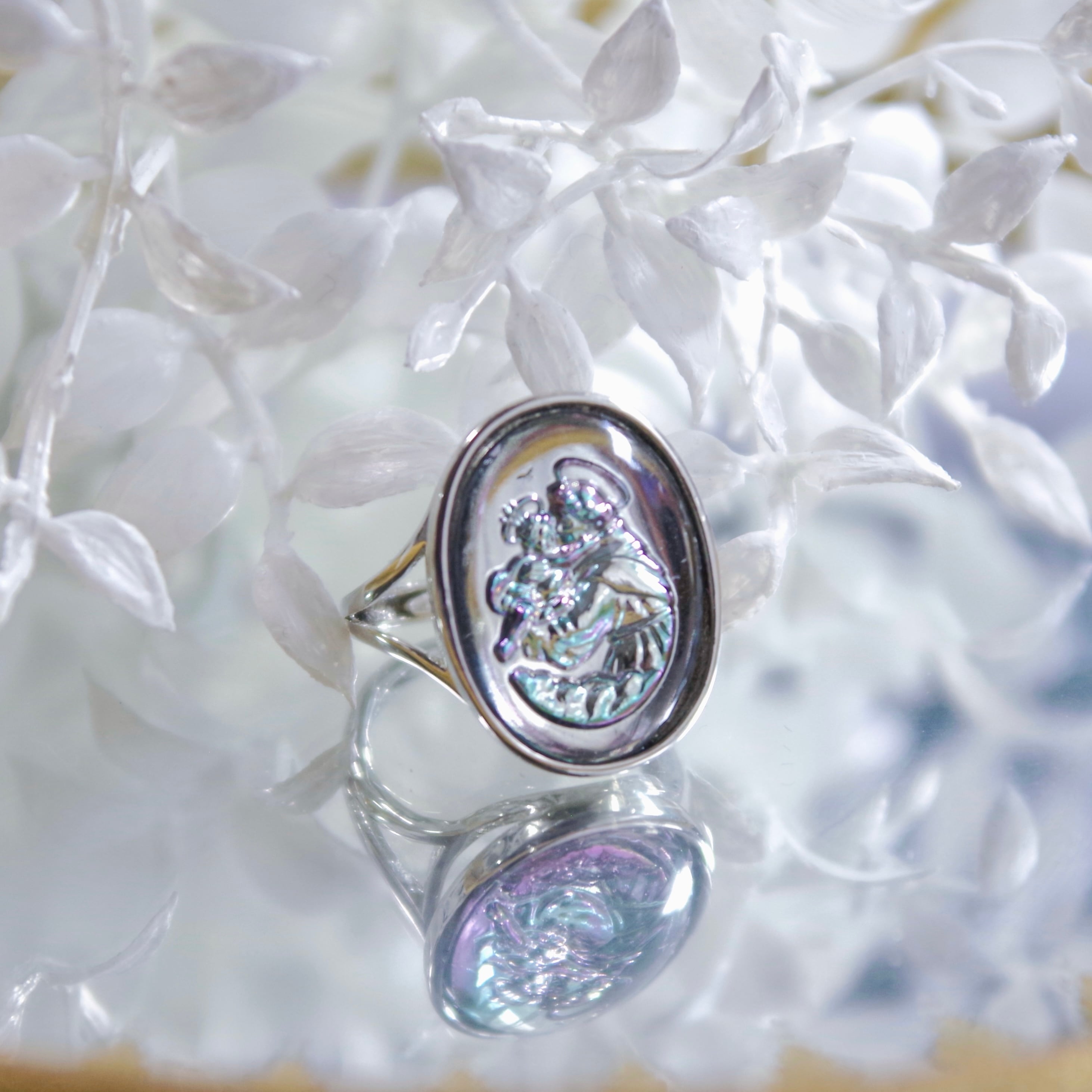 ドイツから仕入れた1970年製のヴィンテージガラスインタリオ。オーロラに輝く聖アントニオに抱き抱えられた幼き日のキリストが浮かび上がる様な裏彫りで描かれた美しいガラスです。