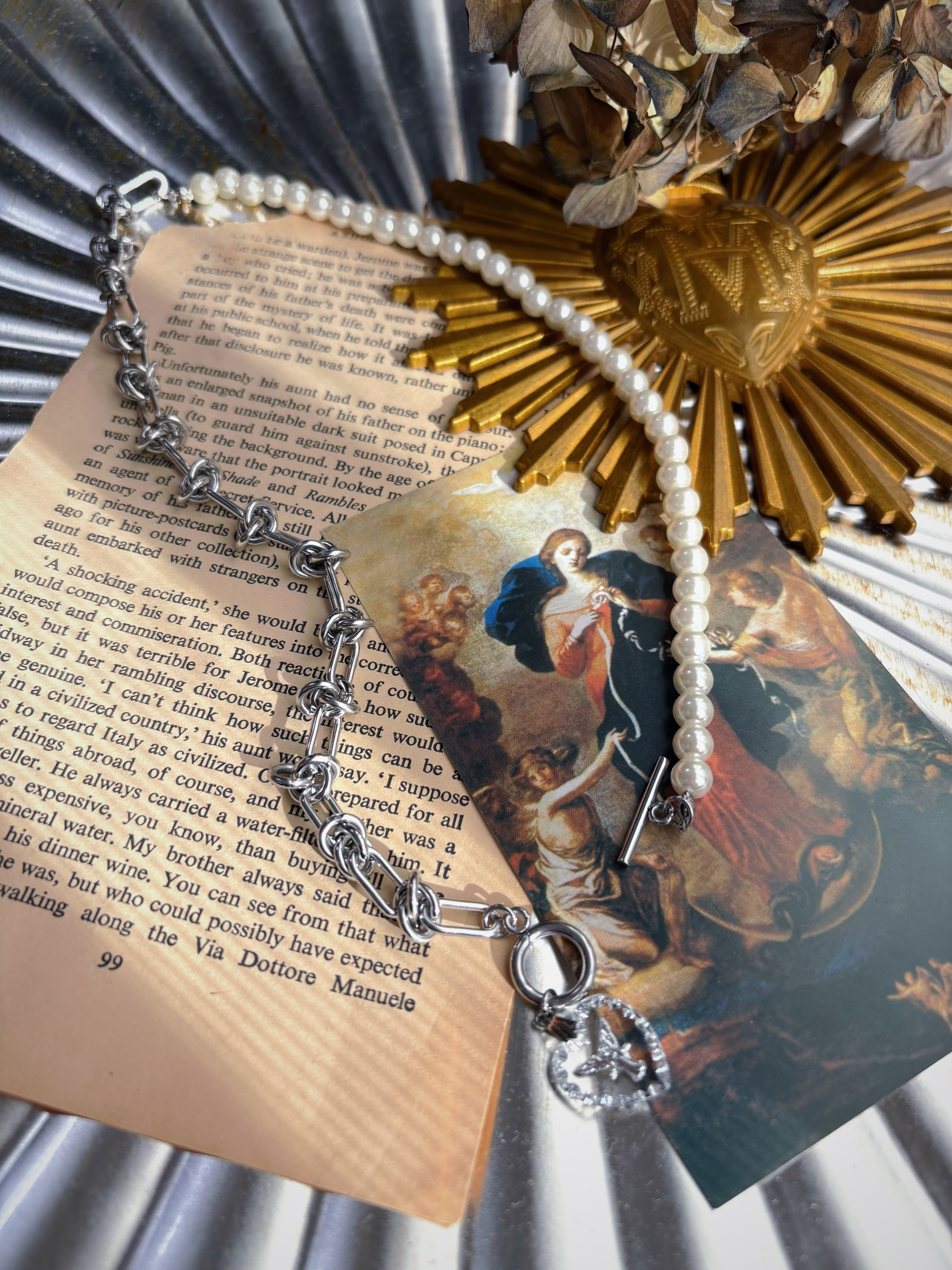 上品なパールとステンレスチェーンの